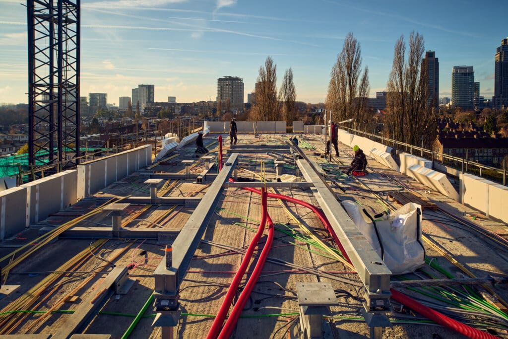 Het gebouw wordt volledig gasloos gerealiseerd. Op het dak komen zonnepanelen en binnen wordt een geavanceerd klimaatsysteem geplaatst. ‘Warmteterugwinning door middel van speciale radiatoren met WTW aan de gevel en warmtepompen,’ somt Nilton op. ‘Duurzaam, modern en gebruiksvriendelijk.’ Naast het klimaatsysteem brengt het project ook logistieke uitdagingen met zich mee. ‘Op het dak hebben we te maken met vele installaties,’ vertelt Edwin. ‘Over twee weken begint de steigerbouwer met het afbreken van de steigers. Dan moeten we misschien aangelijnd werken om de installatie veilig te kunnen uitvoeren. Dat moet uiterst voorzichtig gebeuren.’